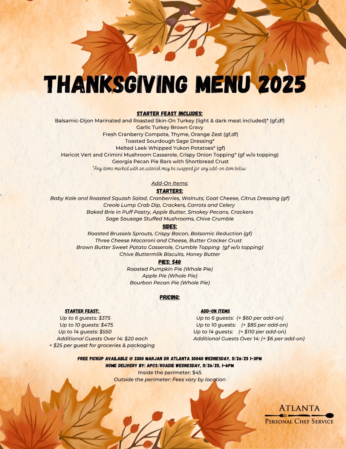 To reserve your order, please call us at 404.916.4633 or email info@atlchefs.com.